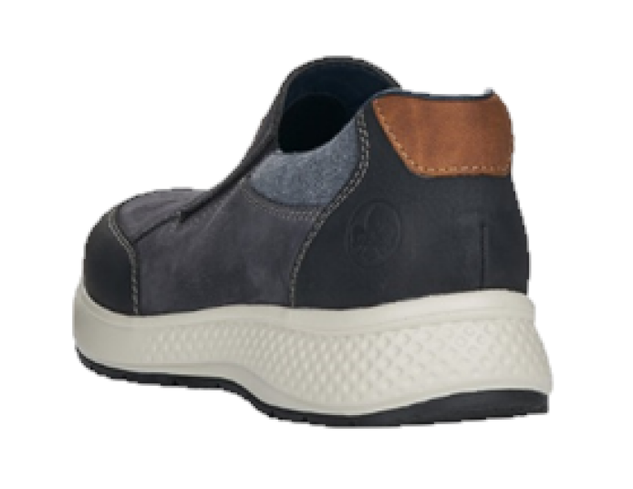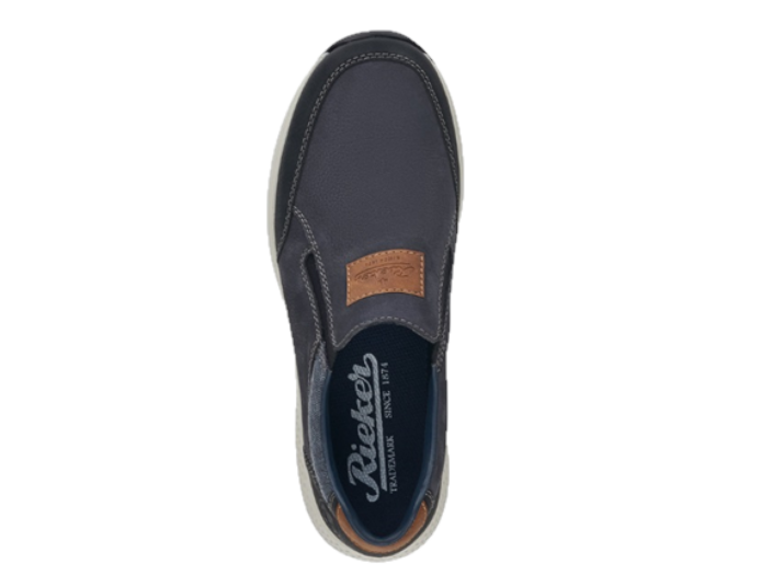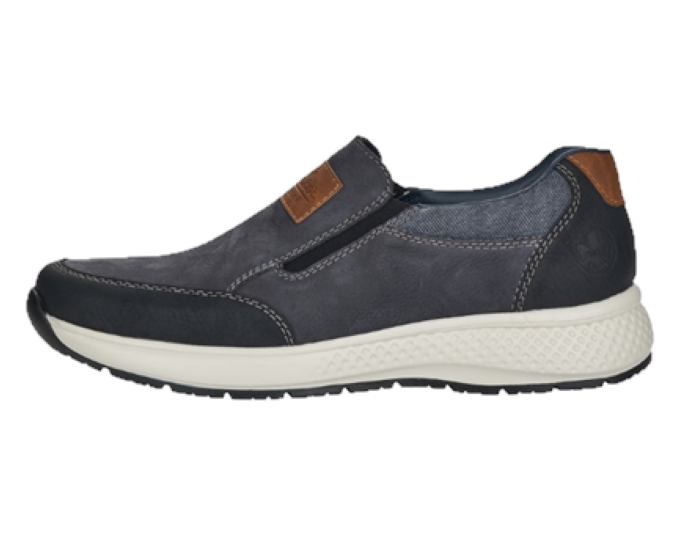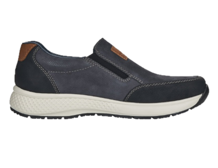 Navy sneaker style slip on shoe. This shoe has double elasticated gussets to allow for easy foot entry and removal.