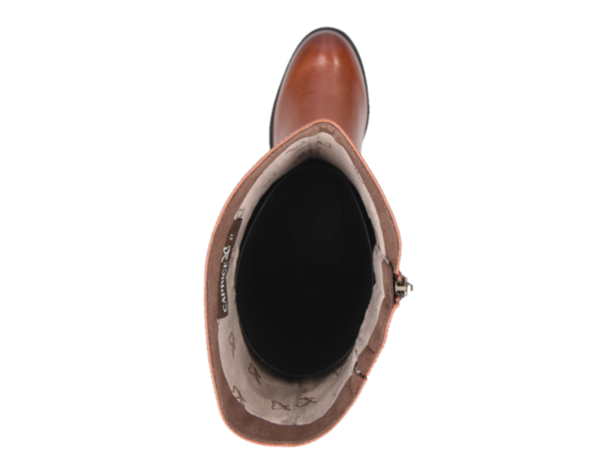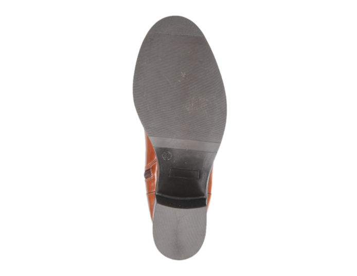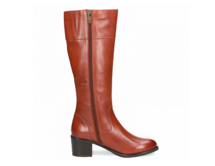 Ladies tan leather low heel knee high boot.