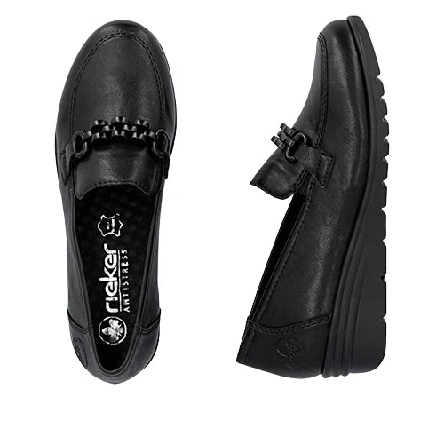 Rieker Ladies Black Low Wedge Loafers:L5361-00