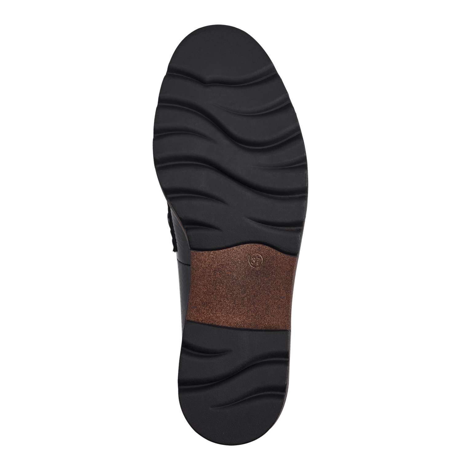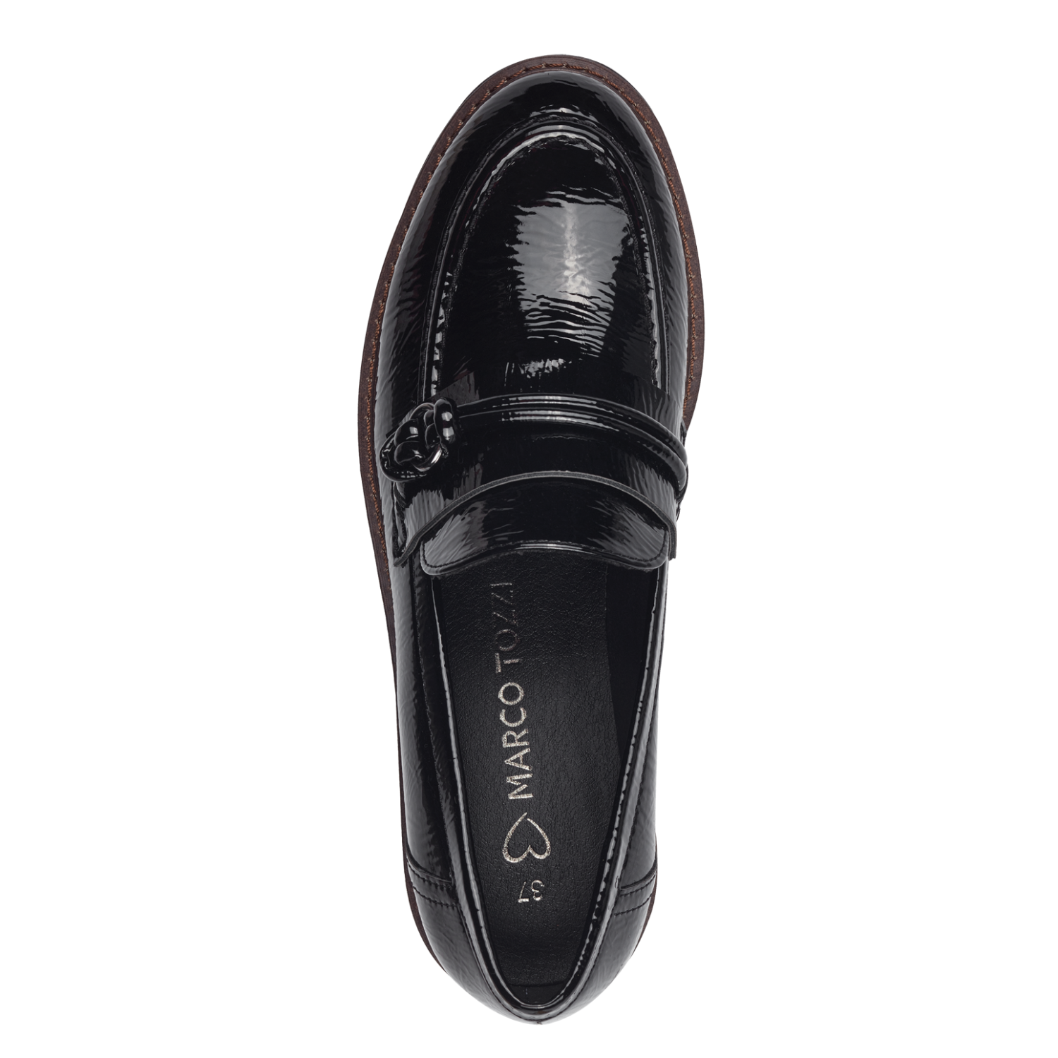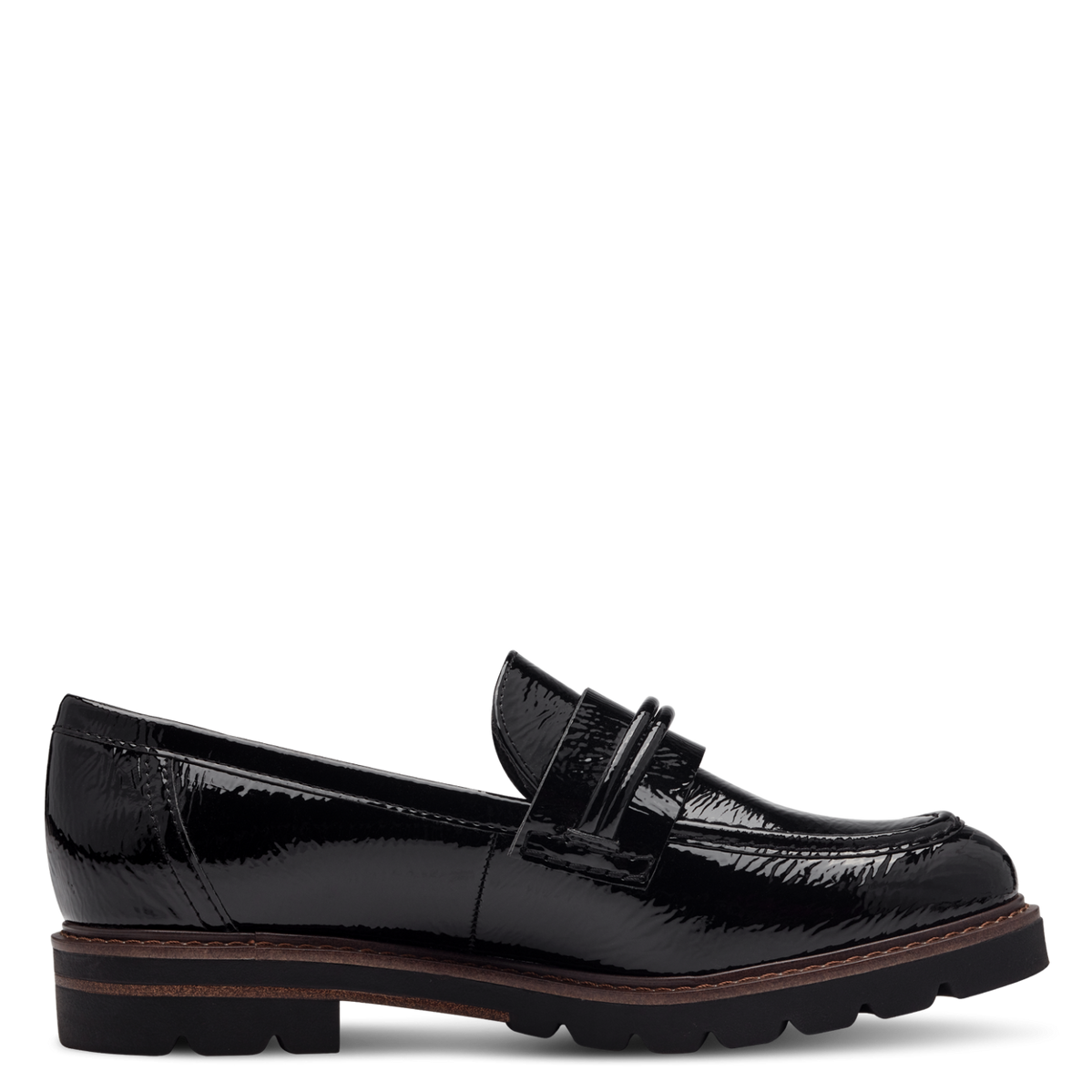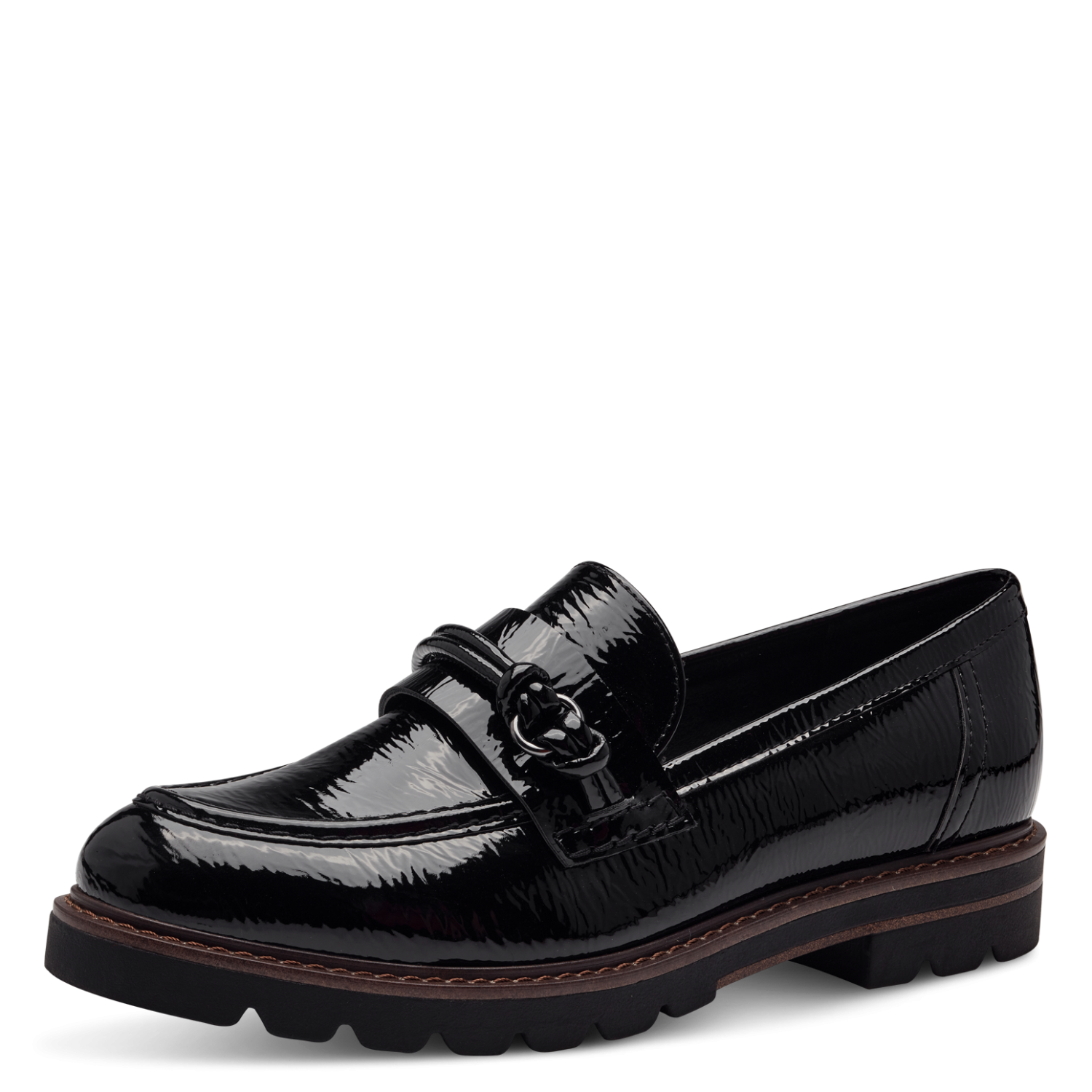 Marco Tozzi ladies black patent thick sole moccasin.