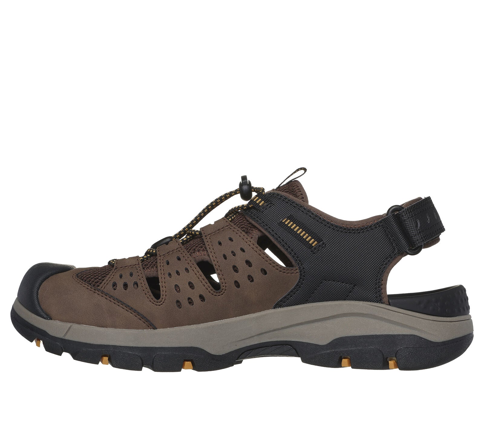 Get right into your adventures in comfort with Skechers Relaxed Fit®: Tresmen - Menard. Featuring a synthetic and mesh upper on a pull-on closed toe river-style fisherman sandal with Luxe Foam® cushioned footbed.